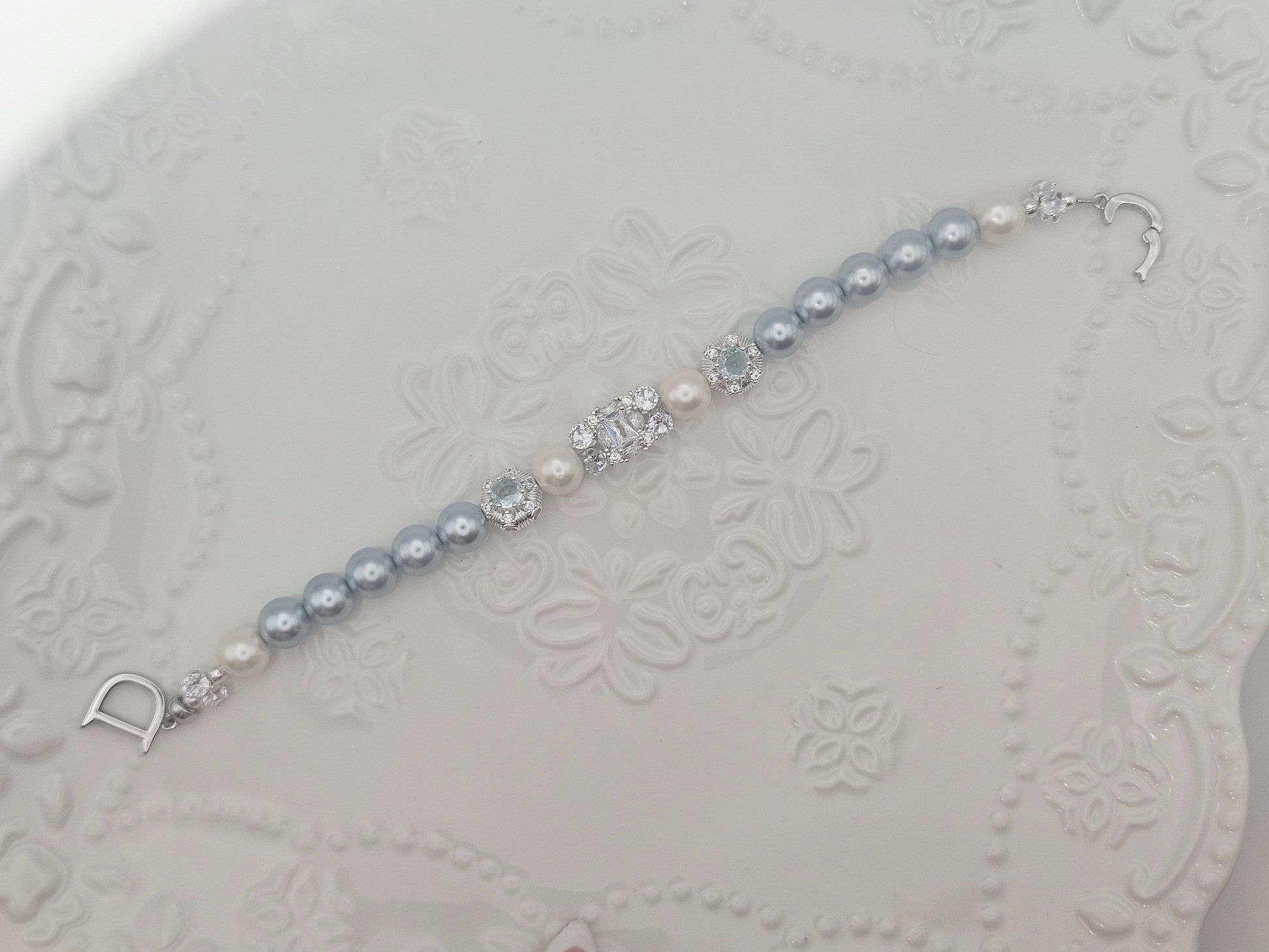 Expertly crafted with 18k silver and diamond spacers, this blue and soft white pearl bracelet is perfect for any occasion. The trendy ribbon of glassbead pearls adds a touch of sophistication to any ensemble. Measuring 6.5" in length, it's the ideal bracelet for day or evening wear.