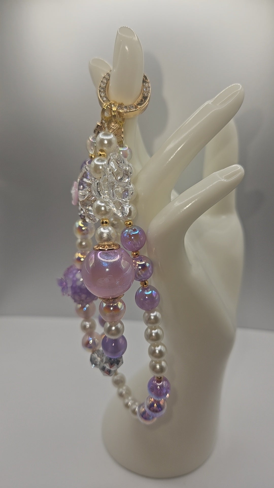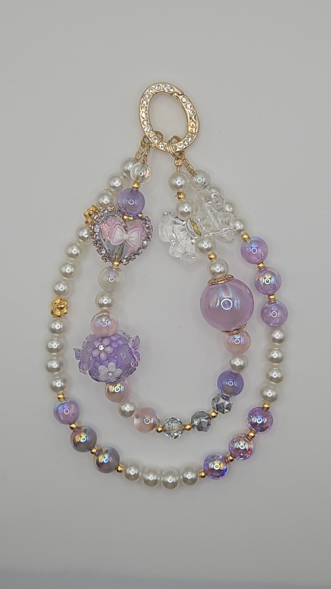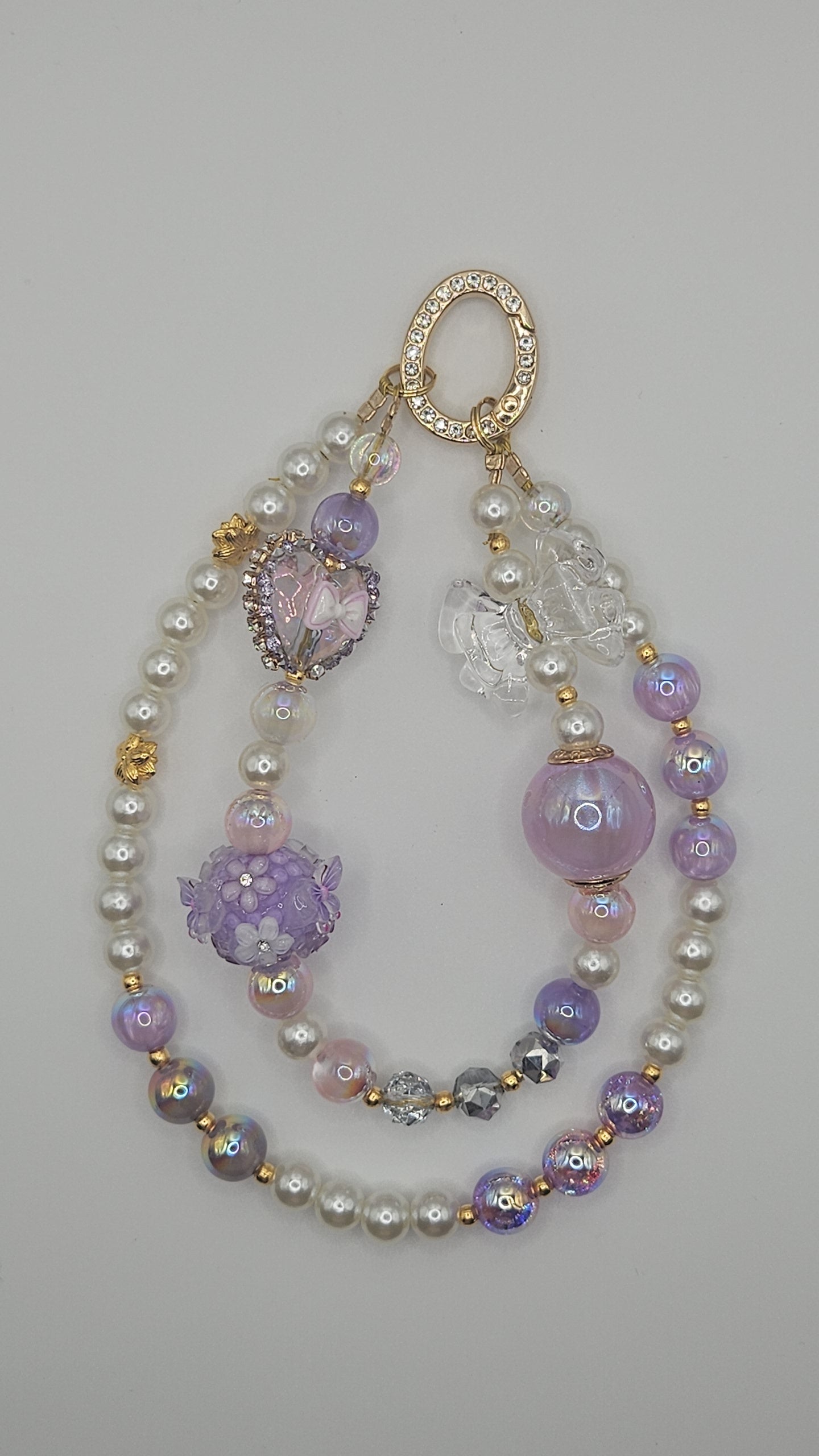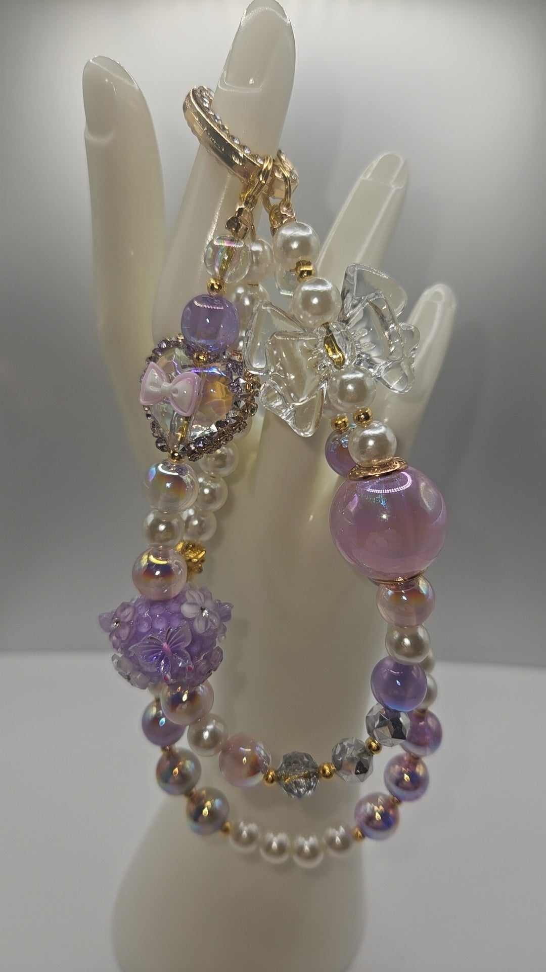 This charming 2 strand design flaunts a charming 3d bow & rhinestone edged heart bead & an array butterfly & flower bead, accented by sparkling beads and pearl beads.