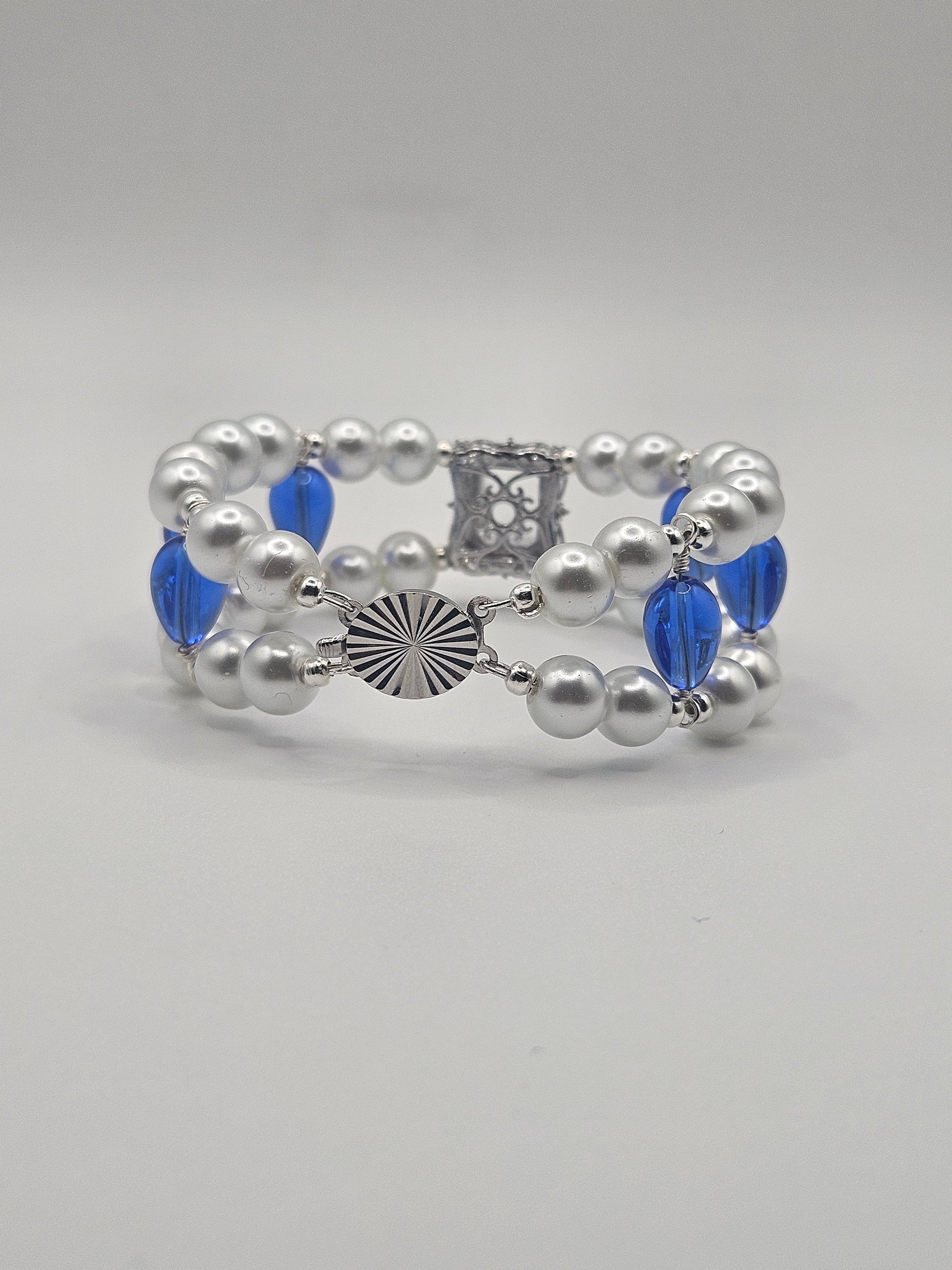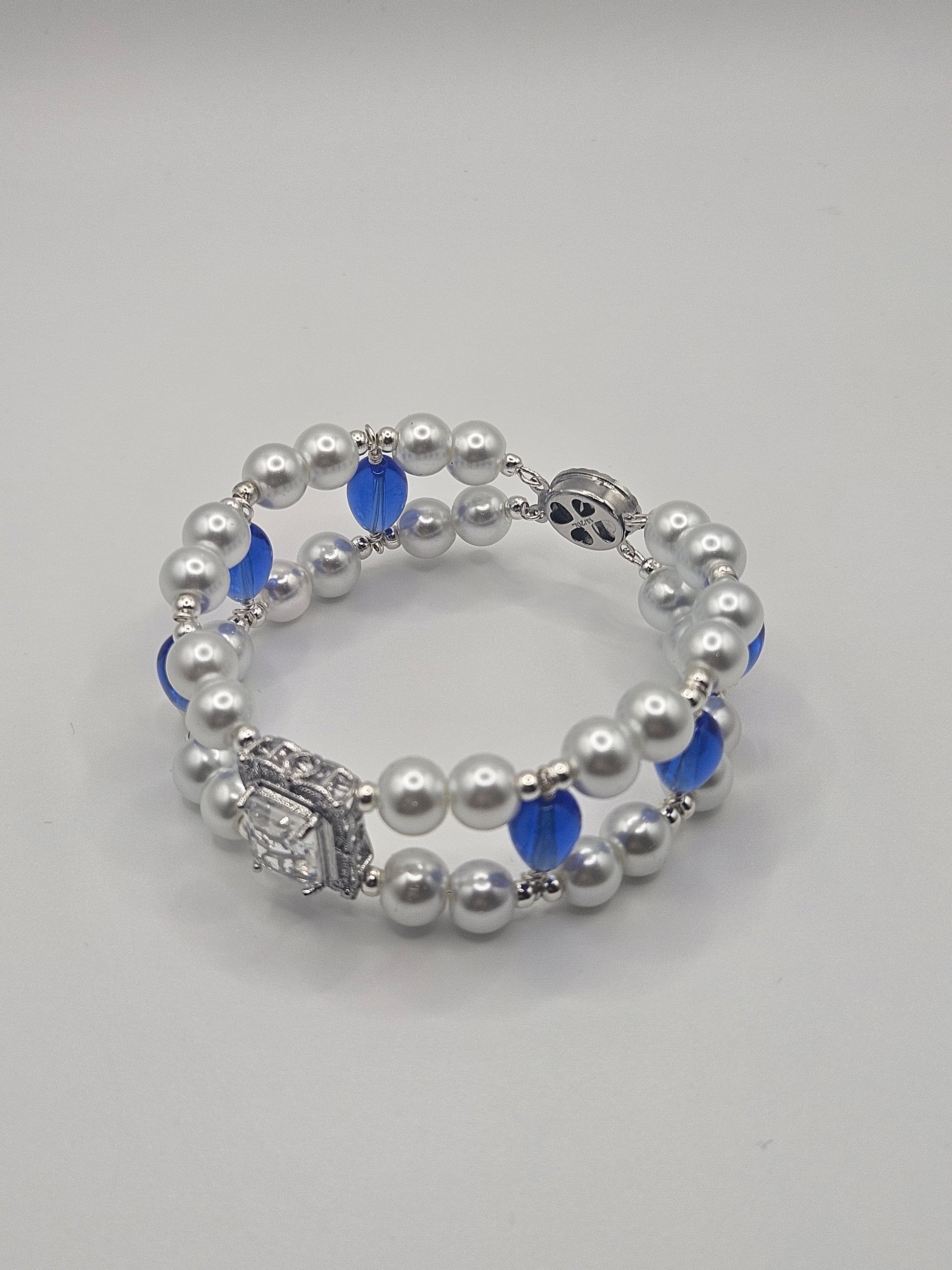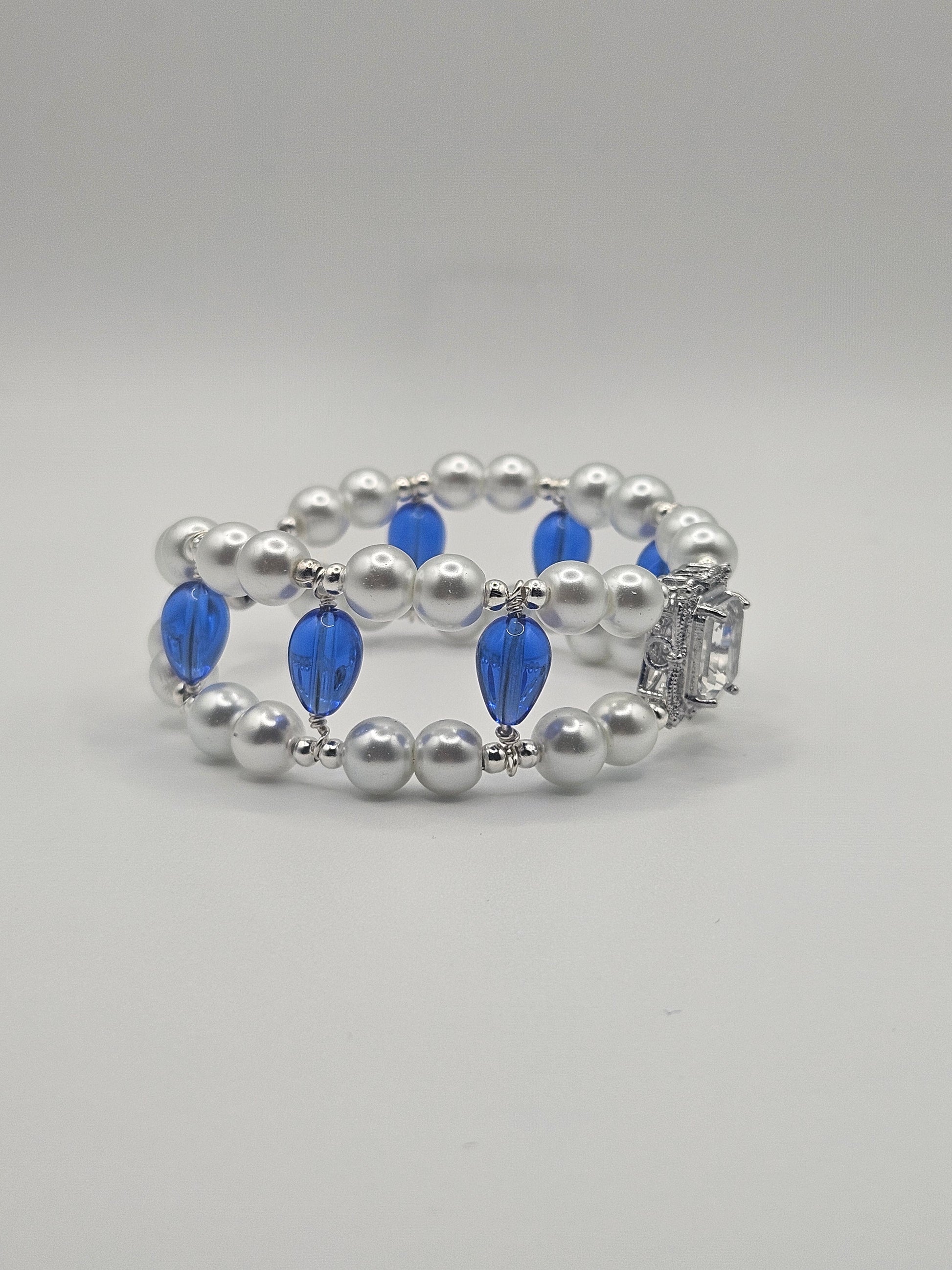 Bangle measures 6.5". Designed with 8mm white glass pearls, royal blue glass beads & 3 cm diamond spacer as center piece.