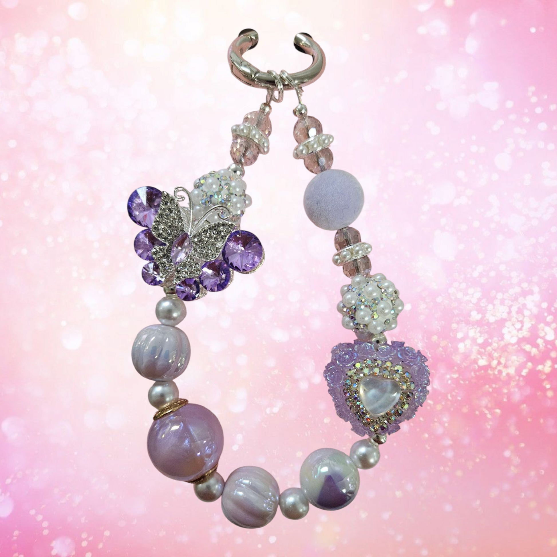 Elevate your phone game with our Violet Phone Charm Wristlet. This charming Phone Charm is designed with acrylic and glass beads, plus two fancy beads (3D metal butterfly and heart shaped bead. This phone charm is designed with 22 g wire ensuring for a long-lasting wear.